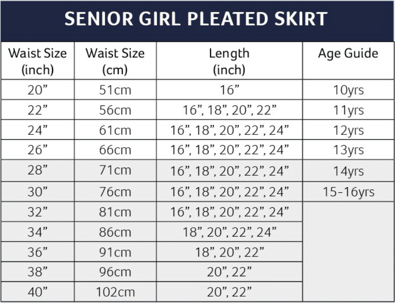 The school skirt length should fall between two inches above the knee or two inches below the knee.